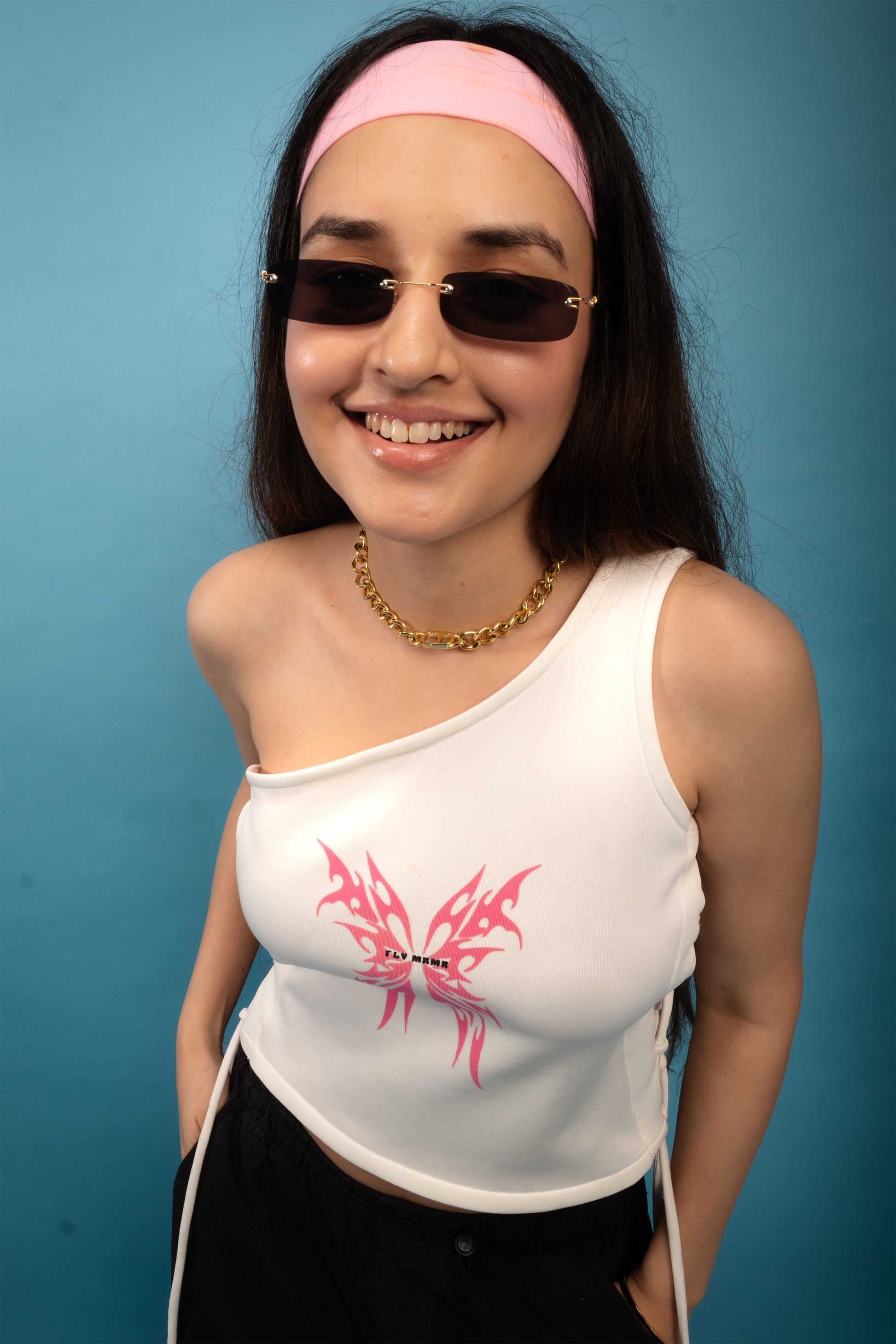 Behold the "Butterfly Breeze," where a delicate ballet of pink butterflies unfolds in intricate high-definition detail. Nature's beauty is captured and etched onto this canvas of style, creating a wearable masterpiece. Infused with our distinctive Fly Mama print, subtly woven into the fabric, this crop top is not just an ensemble—it's a sophisticated emblem of self-expression.