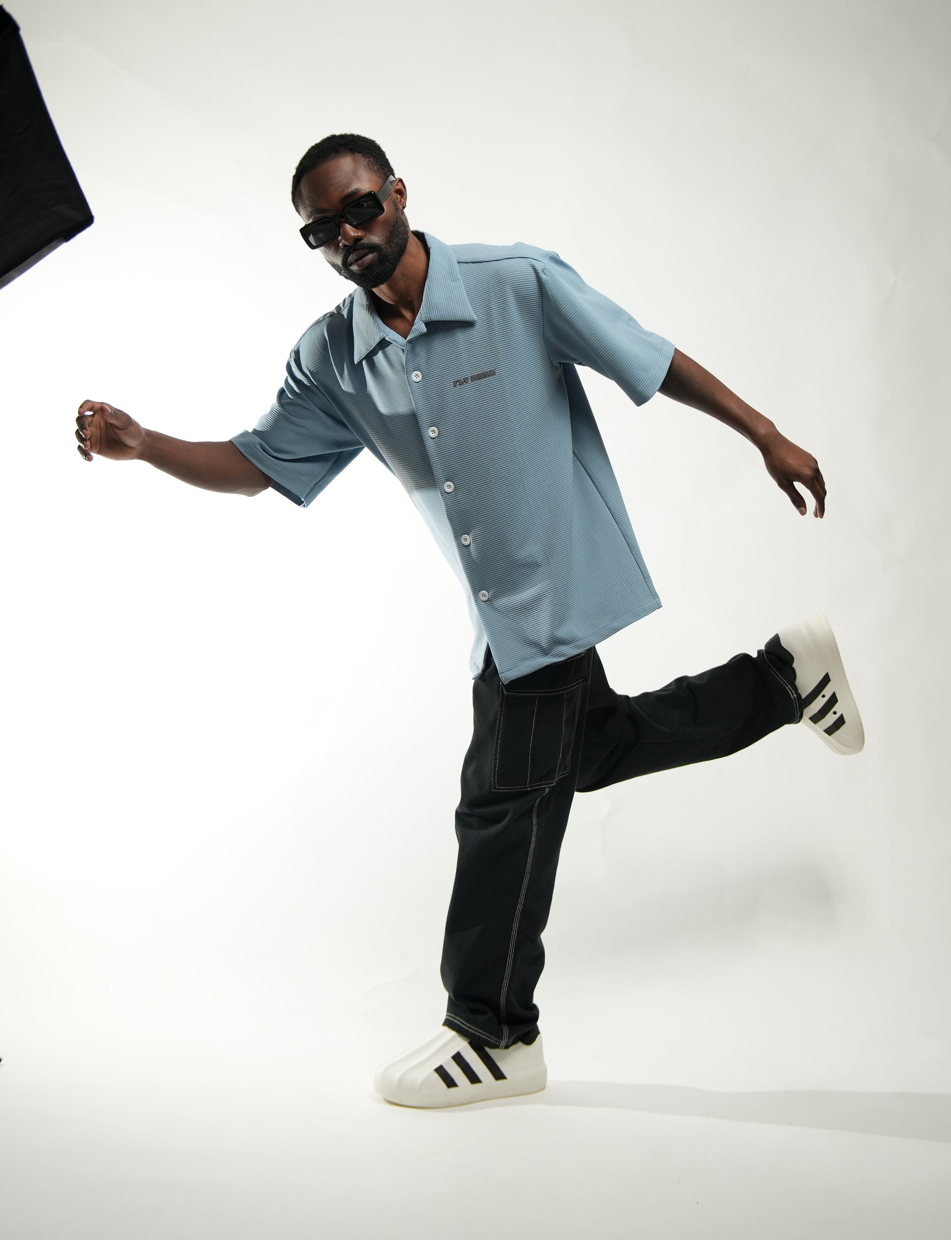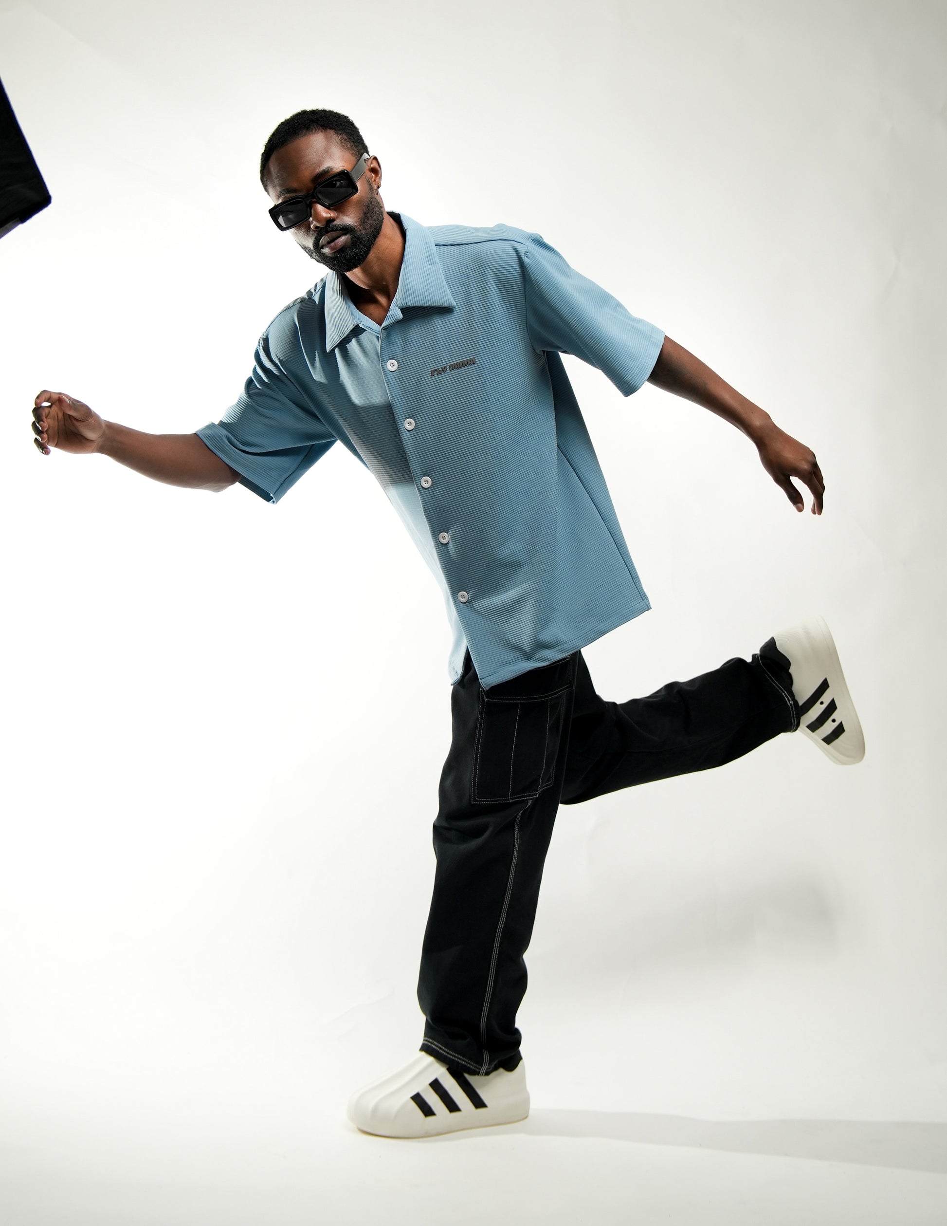 The "Classic Blue Pleated Shirt" transcends ordinary clothing; it is a symbol of refined elegance. Its oversized silhouette boasts broad Cuban collars, evoking an aura of timeless charm and sophistication. These distinctive collars add a classic touch to the modern, oversized design.