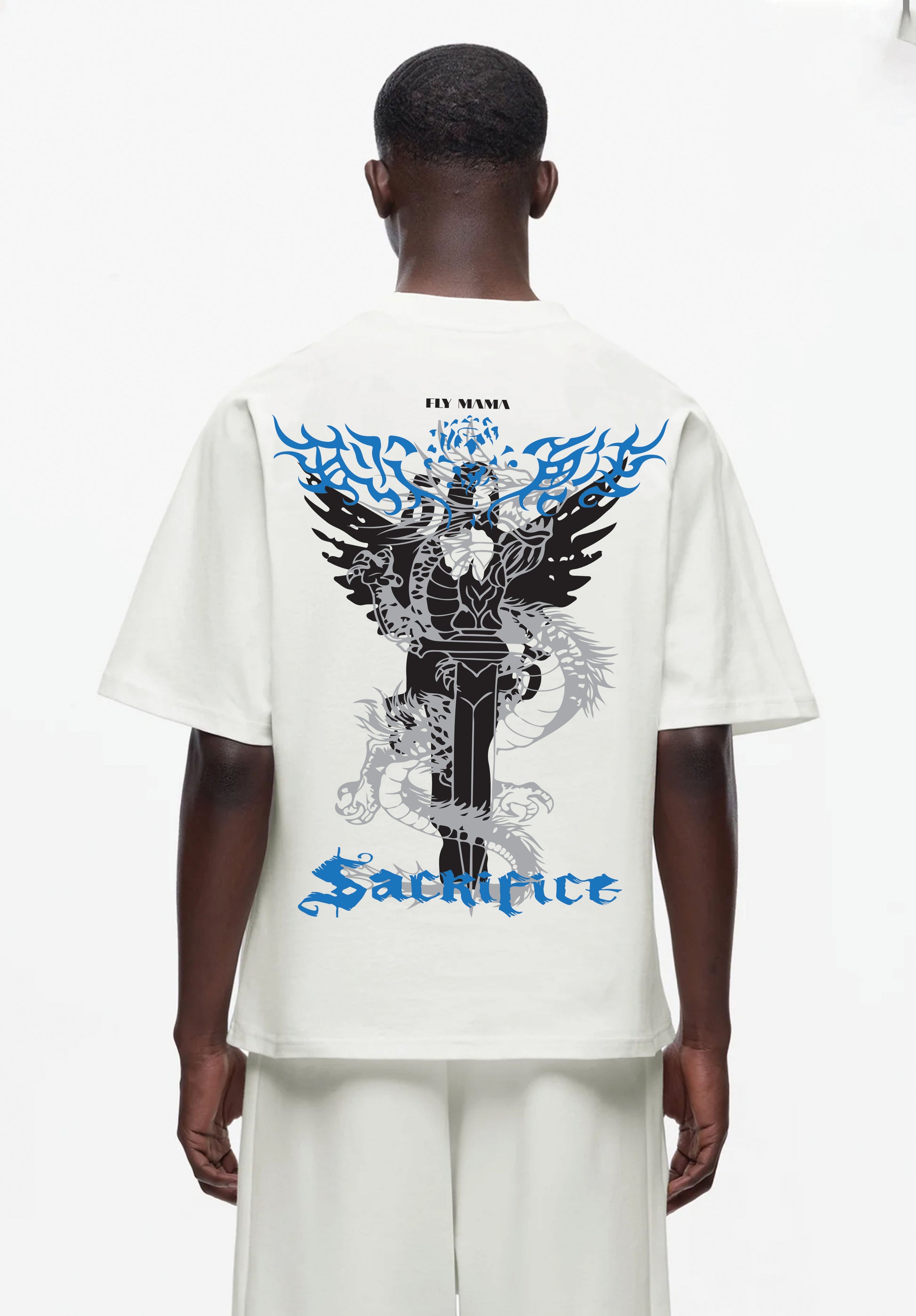 Sacred Sacrifice T-Shirt – A bold fusion of power and mystique. Featuring FM in black on the front, the back showcases a striking black angel entwined with a grey Chinese snake, symbolizing resilience and strength. Blue wings add a celestial touch, while Sacrifice below reinforces the spirit of determination. Finished with a subtle Fly Mama above the design, this piece is a statement of courage and transformation 🖤 #SacredSacrifice